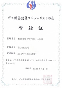 この度、「ガス機器設置スペシャリストの店」として登録されました。